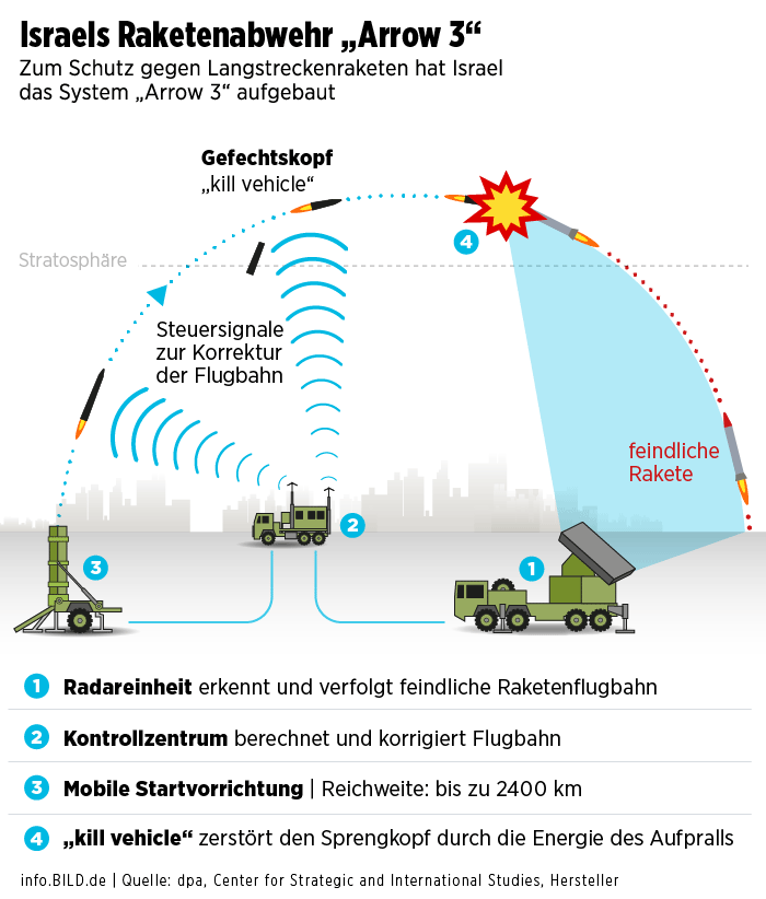 Kur u pyet nga BILD, ushtria izraelite tha se nuk mund të zbuloheshin detaje rreth strategjisë së saj të mbrojtjes. Sipas ekspertëve dhe analistëve, Izraeli përdor një kombinim të disa sistemeve mbrojtëse, duke përfshirë sistemin Iron Dome dhe Arrow. Sipas raporteve të mediave izraelite, sistemi Arrow në veçanti ishte në gjendje të zmbrapste një pjesë të madhe të raketave mbrëmjen dhe natën e kaluar.