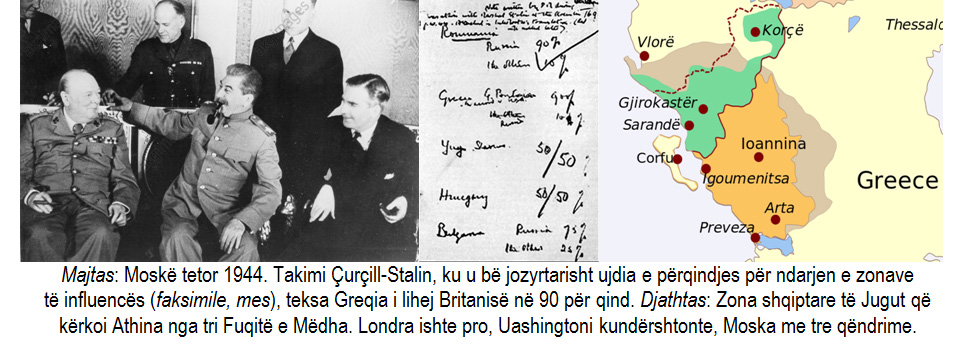 Pas vendimeve të Teheranit për hapjen e frontit të dytë në veri të Francës dhe jo në Ballkan, gjë që do të shënonte automatikisht çlirimin e Evropës Juglindore nga Ushtria e Kuqe, si Londra dhe Moska filluan të bëhen të ndërgjegjshme për harresën e çuditshme (por plotësisht politike) mbi vet faktin e ekzistencës së Shqipërisë. Më 9-18 tetor 1944, gjatë vizitës së tij në Moskë, kryeministri britanik Uinston Çurçill (Winston Churchill, 1874-1965) kishte arritur të përfundonte me J. V. Stalinin ujdinë verbale të “marrëveshjes së përqindjeve” mbi “sferat e influencës” në Ballkan midis Bashkimit Sovjetik dhe Perëndimit (përkatësisht në Rumani, Greqi, Jugosllavi , Hungari dhe Bullgari) në një përqindje të caktuar, ndërsa për kryeministrin britanik kishte rëndësi çështja e Greqisë. Megjithatë, në këtë listë nuk ishte një nga vendet e Ballkanit. Më vonë, Çurçilli i ka thënë Entoni Idenit se ai thjesht “harroi Shqipërinë”, ndikimi në të cilën duhej ndarë, “natyrisht, 50 me 50 për qind”