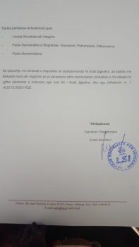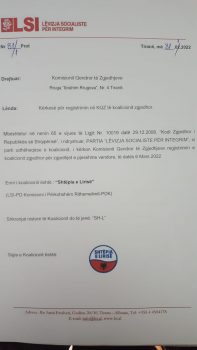 Mbështetur në nenin 65 e vijues te Ligjit Nr 10019 date 29 12.2008, Kodi Zgjedhor i Republikes se Shqiperisë”. ndryshuar, PARTIA “LEVIZJA SOCIALISTE PËR INTEGRIM”, si parti udhëheqese e koalicionit, kerkon Komisionit Qendror të Zgjedhjeve regjistrimin e koalicionit zgjedhor për zgjedhjet e pjesshme vendore, te dates 6 Mars 2022.