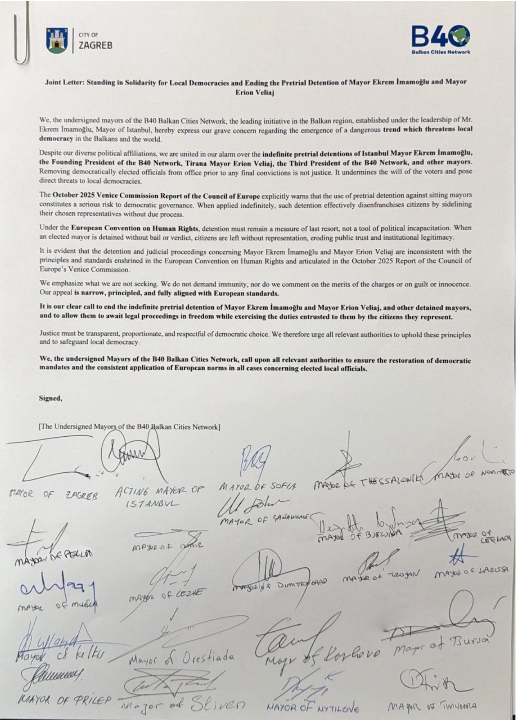 Ne, të nënshkruarit kryetarë të bashkive të Rrjetit të Qyteteve të Ballkanit B40, nisma më e rëndësishme e rajonit të Ballkanit, e themeluar nën udhëheqjen e z. Ekrem İmamoğlu, Kryetar i Bashkisë së Stambollit, shprehim shqetësimin tonë të thellë lidhur me shfaqjen e një trendi të rrezikshëm që kërcënon demokracinë vendore në Ballkan dhe në botë.
