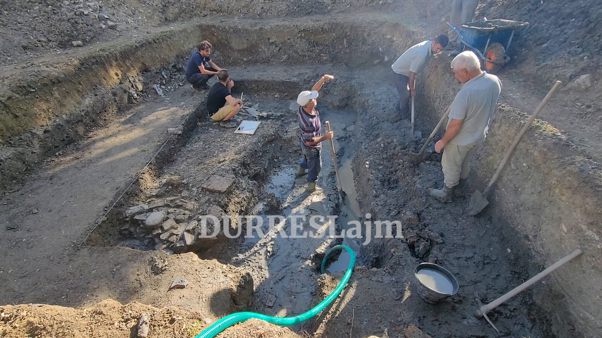 “Këtu ndodhemi në relievin më të ulët të qytetit, fare pranë hapësirës kënetore që ka rrethuar gjithnjë anën lindore të Durrësit dhe ujërat nëntokësore dalin menjëherë në thellësinë 1.4 metër prandaj e kemi problem të vazhdueshëm. Punojmë me një pompë gjatë të gjithë kohës, që të kemi mundësi të evakuojmë ujin jashtë dhe të vazhdojmë gërmimin. E sigurt është që nuk kemi mundësi të shkojmë shumë thellë, më shumë se dy metra thellësi nuk është e mundur në këto kushte thellësie” .