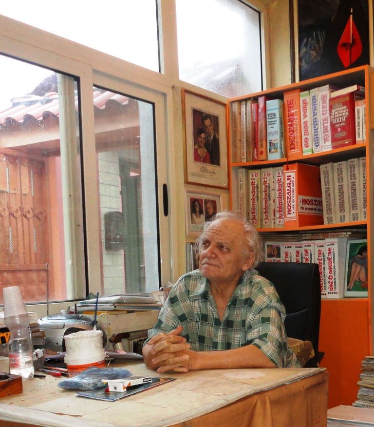 Në studion e vogël në hyrje të oborrit ka vazhdimisht njerëz dhe ai ka për të gjithë nga një muhabet të veçantë e shumë të këndshëm.