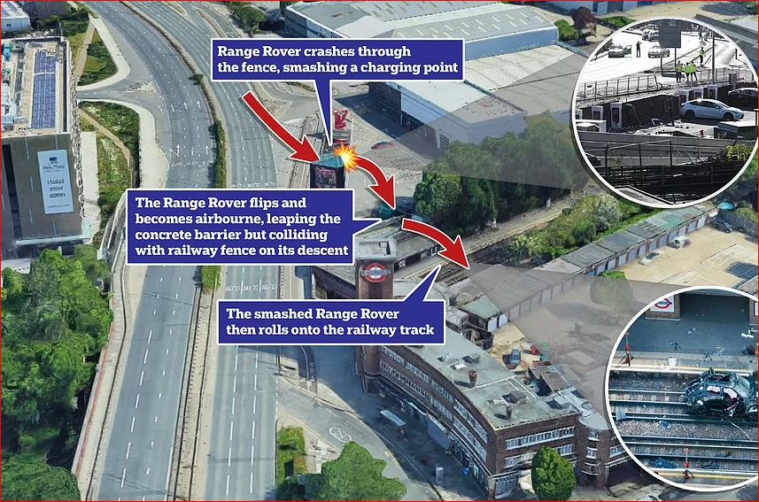 Videot dhe fotot nga vendngjarja tregojnë se “Range Rover” ishte larguar nga karrexhata e dyfishtë dhe u përplas me bordurat mbrojtëse përpara se të kalonte nëpër stacionin e karikimit që kthehet në linjën hekurudhore.