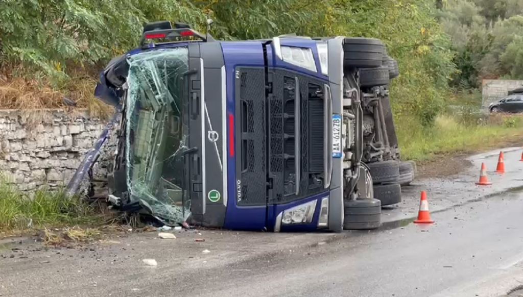 Autoboti po transportonte vajra bimore, në momentin e daljes nga rruga ku paraprakisht dyshohet se ka ndodhur për shkak të lagështirës.