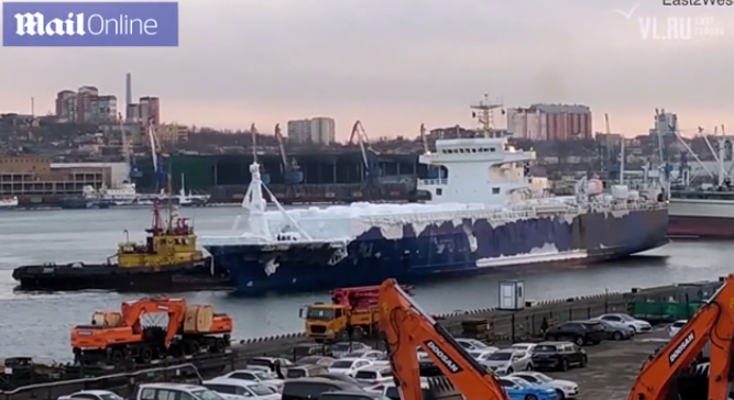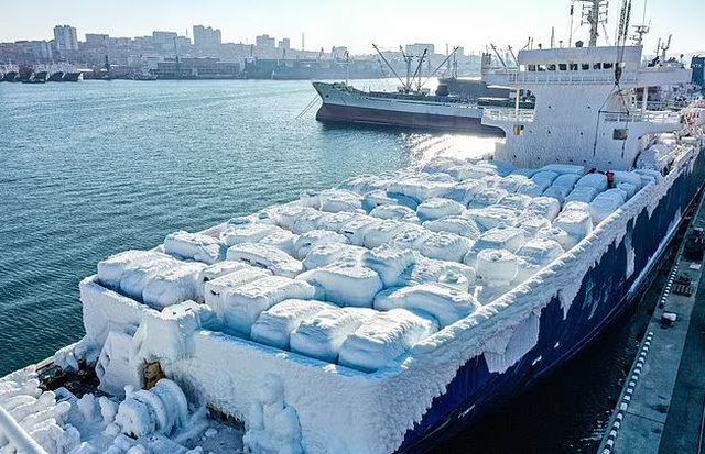 Automjetet e ngrira u hoqën nga kuverta me një vinç në temperatura -19C (-2F) në kryeqytetin rus të Paqësorit të martën, 28 dhjetor.