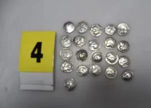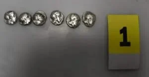44-vjeçari shqiptar, kishte ndërmend t’i shiste antiket një blerësi për afro 100 mijë euro, sipas “Kathimerini”. Monedhat ishin pjesë e një “thesari” nga një varr i lashtë. Midis tyre ishte një tetradrahmë argjendi që përshkruante Aleksandrin e Madh dhe Zeusin, me vlerë 5000 €.