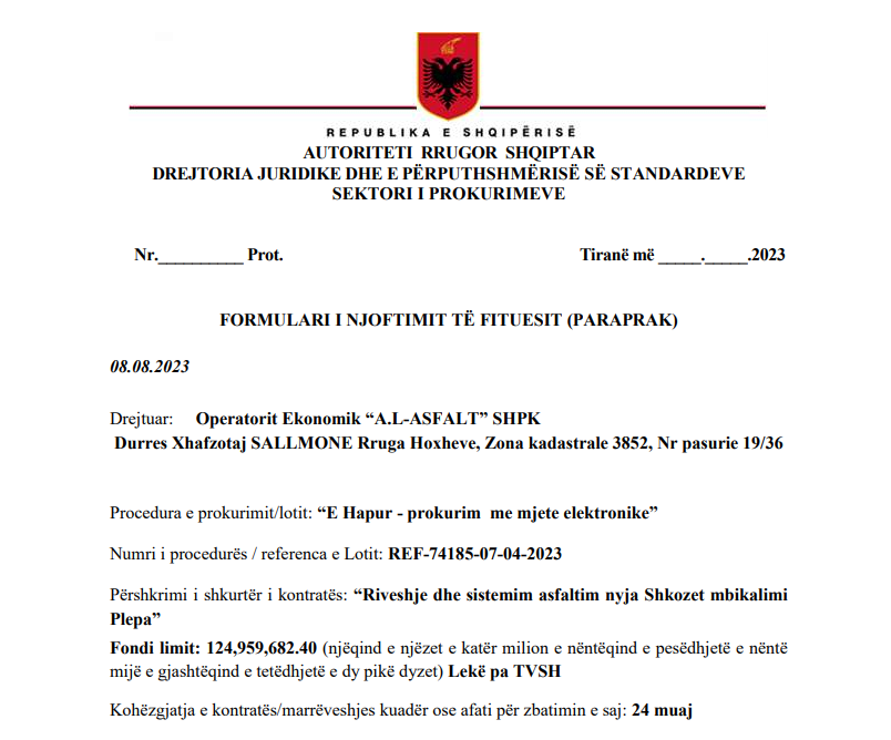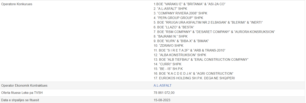 Siç duket edhe në dokumentet e tenderit, që po publikon “DurrësLajm”, Komisioni i Prokurimit Publik ka shpallur fitues më datë 15 gusht kompaninë AL-ASFALT, që ka ofruar 78.8 milionë lekë për realizimin e këtij investimi publik.