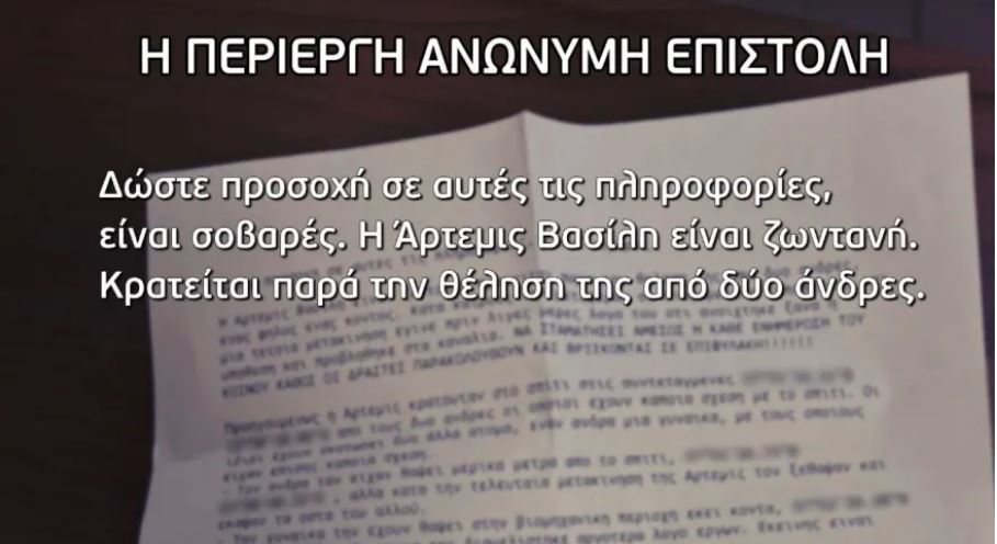 Në letrën e publikuar nga Protothema shkruhet se; “Kushtojini vëmendje këtij informacioni, është serioz. Artemis Vassilis është gjallë. Ajo po mbahet kundër dëshirës së saj nga dy burra. Herë pas here ajo transferohej në një lokacion tjetër dhe një lëvizje e tillë ishte bërë pak ditë më parë për faktin se çështja ishte rihapur dhe shfaqur në kanale. MENJËHERË TË NDASH CDO INFORMACION TË PUBLIKUT PASI AKTORËT TË MONITOROHEN DHE JANË NE ALARM”, shkruhet në letrën e dërguar. Po ashtu në këtë letër, personi në fjalë që e ka dërguar tregon koordinata në Koropi nga është zhdukur Artemida.