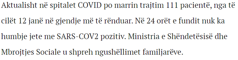 Megjithatë, ajo që i ra në sy kujtdo, ishte se ministria e Shëndetësisë nuk kishte harruar t’i dërgonte ngushëllimet familjarëve të 0 viktimave, që u regjistruan në vend në 24-orëshin e fundit.