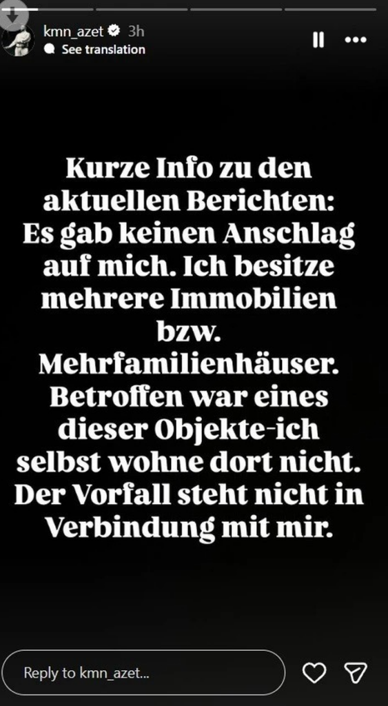 Reperi i njohur me origjinë nga Kosova, Azet, ka reaguar publikisht pas raportimeve të mediave gjermane, të cilat shkruanin se një pajisje shpërthyese kishte shpërthyer mbrëmjen e së mërkurës në hyrje të një pallati në Düsseldorf, objekt që figuron në pronësi të artistit.