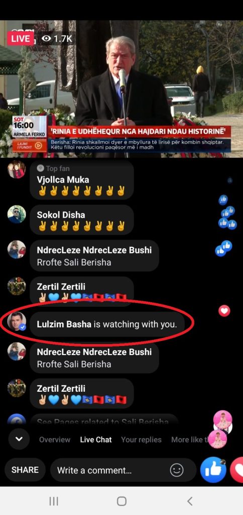 Ndërkohë, në mediat sociale dhe në rrjet është shpërndarë një foto ku duket emri i Lulzim Bashës që i bashkohet videos live të Berishës.