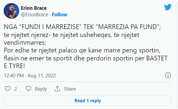 “NGA “FUNDI I MARREZISE” TEK “MARREZIA PA FUND”; te njejtet njerëz – te njejtet usheheqes, te njejtet vendimmarres; Por edhe te njejtet palaco qe kane marre peng sportin, flasin ne emer te sportit dhe perdorin sportin per BASTET E TYRE!”, shkruan Braçe.