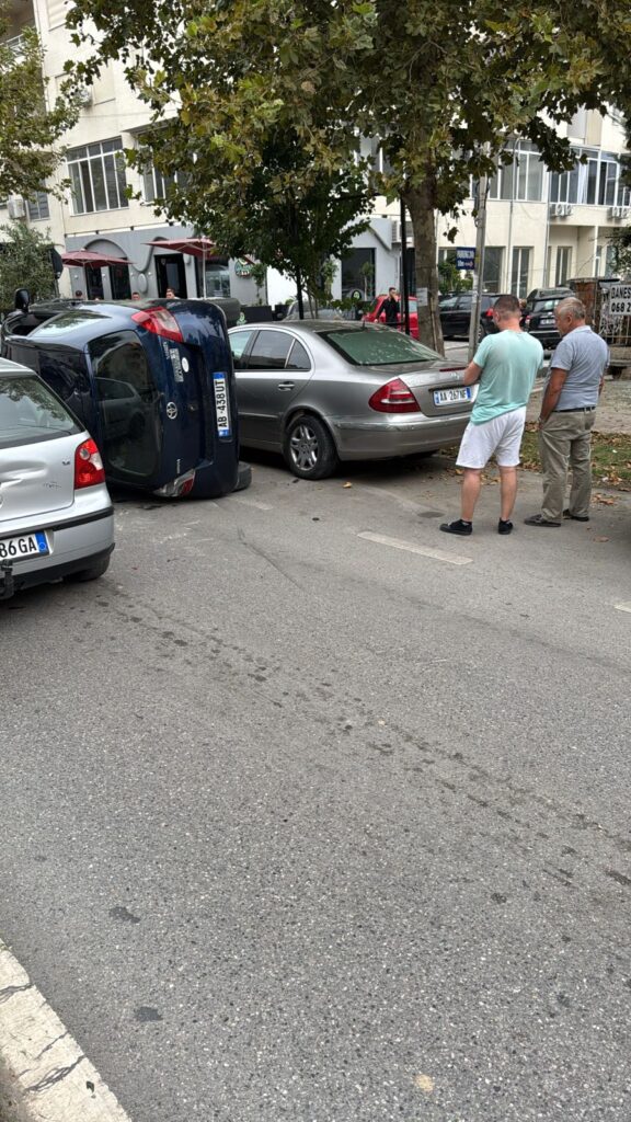 Mjeti tip Toyota Yaris ka përfunduar e kthyer në një anë në mes të rrugës, ndërsa mjetet e tjera vijojnë të lëvizin në të dy anët e saj.