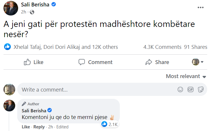 “A jeni gati për protestën madhështore kombëtare nesër?”, shkruan Berisha në Facebook, ndërsa u kërkon pjesëmarrësve të komentojnë.