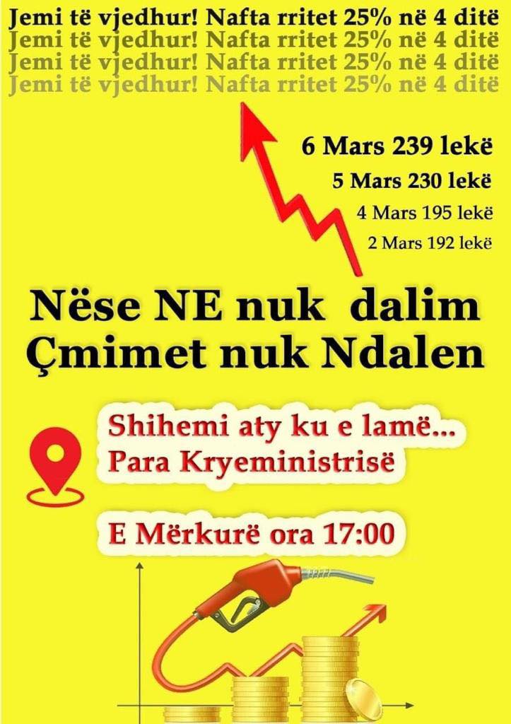 Berisha ka postuar njoftimin për protestën, e organizuar nga aktivistë të shoqërisë civile dhe shkruan: Tirana në shesh në ora 17:00 kundër qeverisë për rritjen e çmendur të çmimit të naftës! sb