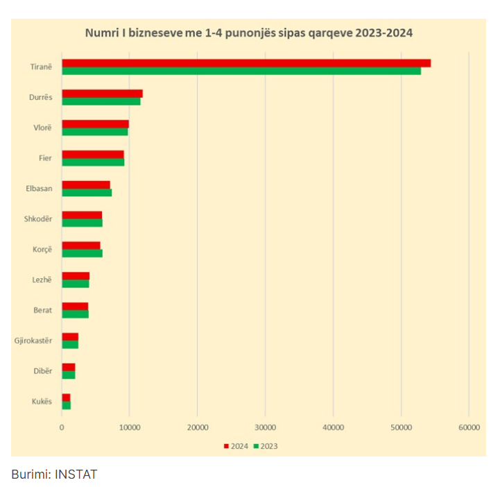Sipas të dhënave zyrtare të INSTAT, nga 12 qarqe të vendit në 8 prej tyre numri i bizneseve me 1–4 punonjës ka shënuar rënie. Reduktimi në 2024 ishte më i theksuar në Korçë me 312 biznese më pak ose −5.21% në raport me 2023. Pas saj vijnë Elbasani me minus 302 biznese ose −4.07% dhe Gjirokastra me minus 48 biznese ose me rënie 2%.