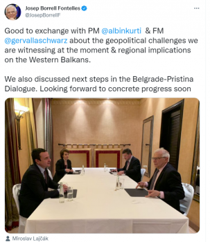 “Shkëmbime të mira me kryeministrin Albin Kurti dhe ministren e Jashtme, Donika Gërvalla në lidhje me sfidat gjeopolitike që po shohim për momentin dhe implikimet rajonale në Ballkanin Perëndimor. Ne diskutuam gjithashtu edhe hapat e ardhshëm në dialogun Beograd-Prishtinë. Mezi presim së shpejti të kemi përparim konkret”, ka shkruar Borrell.