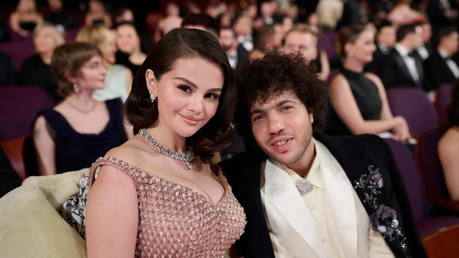 Në foto të tjera, Selena pozon me të fejuarin Blanco, i cili kishte veshur një xhaketë kadifeje mbi një këmishë me print shtazësh dhe jakë të ekzagjeruar. Ai kishte kombinuar pamjen retro me syze të rrumbullakëta dhe mokasina me print shtazësh.
