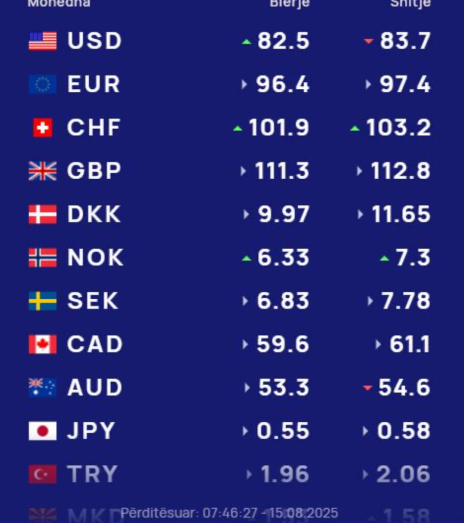 Ndërsa paundi britanik do blihet me 111.3 lekë dhe do shitet me 112.8 lekë.