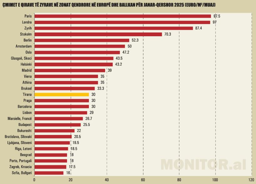 Çmimet e qirave për zyra në qendër të Tiranës vijuan të mbeten 30 euro për metër katror edhe për 6-mujorin e dytë të 2025-s, duke u barazuar me ato të Barcelonës dhe Pragës, dy tregje të konsoliduara në Europë.