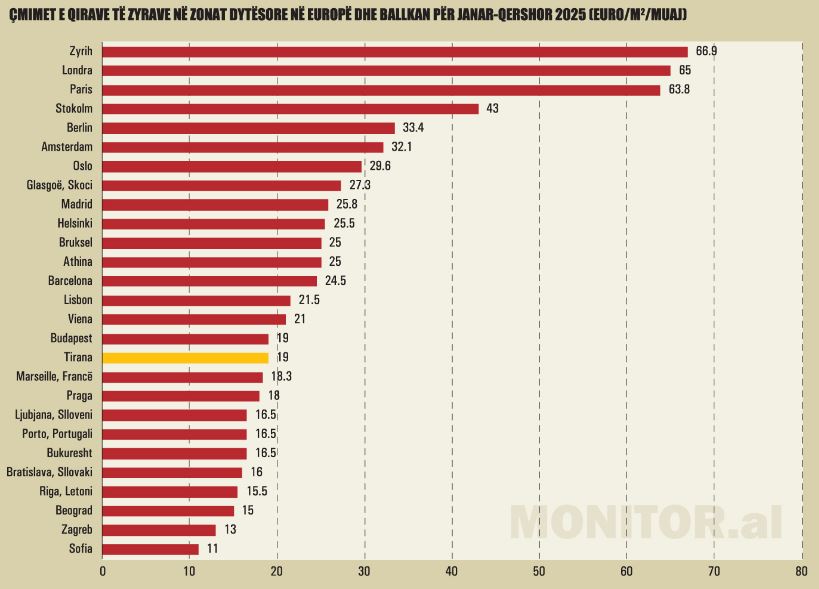 Në Zagreb të Kroacisë çmimet janë 17.5 dhe në Sofje të Bullgarisë 16 euro për metër katror në muaj.
