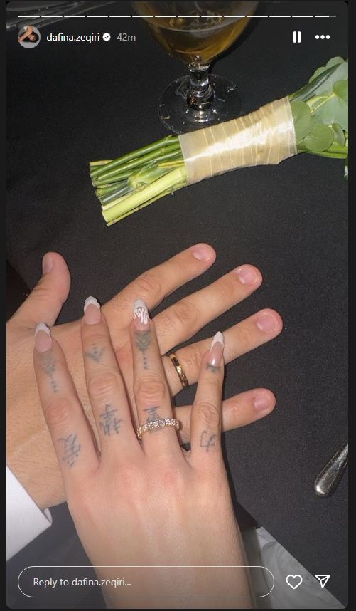 Nga fotot duken unazat e martesës, dhe në tavolinë lulet. Gjithashtu në thonjtë e Dafinës, lexohet ‘Mrs’, që nënkupton se i ka dhënë fund beqarisë.