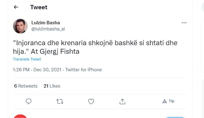 Përmes një postimi i “Twitter”, Basha ka publikuar një shprehje të At Gjergj Fishtës, ku shkruan se “Injoranca dhe krenaria shkojnë bashkë si shtati dhe hija.”