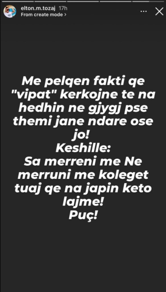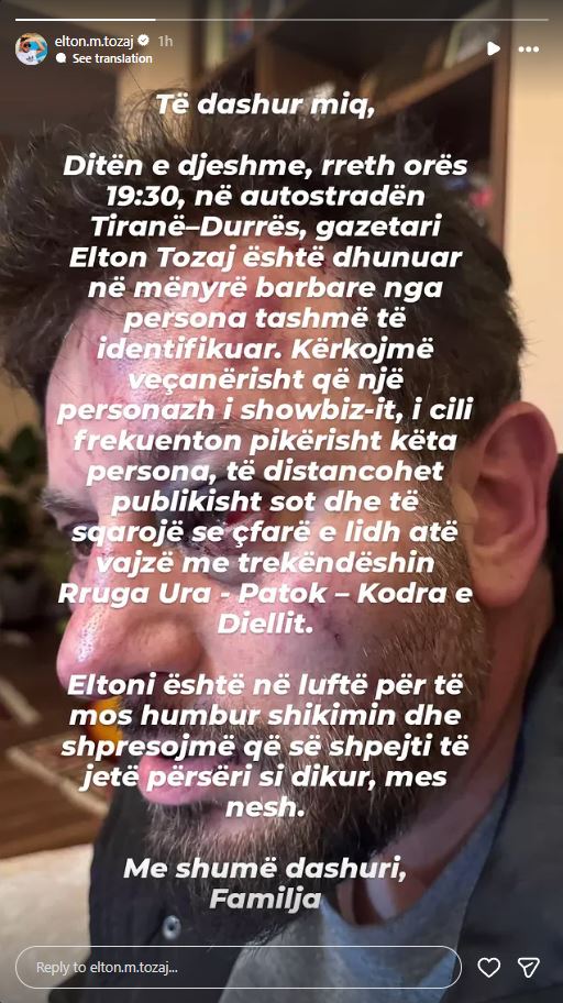 “Të dashur miq, Ditën e djeshme, rreth orës 19:30, në autostradën Tiranë-Durrës, gazetari Elton Tozaj është dhunuar në mënyrë barbare nga persona tashmë të identifikuar. Kërkojmë veçanërisht që një personazh i shoëbiz-it, i cili frekuenton pikërisht këta persona, të distancohet publikisht sot dhe të sqarojë se çfarë e lidh atë vajzë me trekëndëshin Rruga Ura – Patok – Kodra e Diellit. Eltoni është në luftë për të mos humbur shikimin dhe shpresojmë që së shpejti të jetë përsëri si dikur, mes nesh. Me shumë dashuri, Familja”, shkruajnë ata.