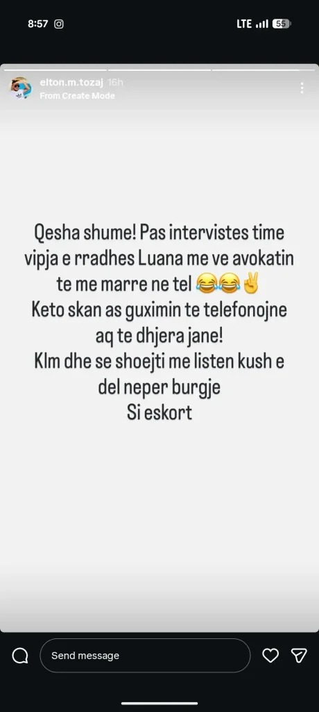 Tozaj vetë e bëri këtë publik përmes një postimi në “Instagram Story”, duke shkruar: “Qesha shumë! Pas intervistës time vip-ja e radhës Luana më vë avokatin të më marrë në telefon. Këto s’kanë as guximin të telefonojnë aq të dhjera janë! Klm dhe së shpejti me listën kush del nëpër burgje si eskort”.