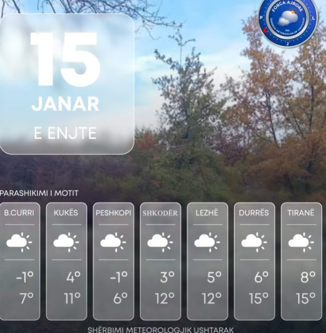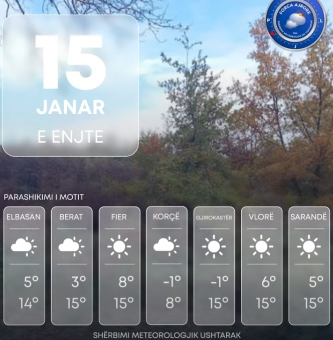 Ditën e sotme vendi ynë do të ndikohet nga kushte atmosferike të qëndrueshme. Moti parashikohet alternime kthjellimesh e vranësirash kalimtare.