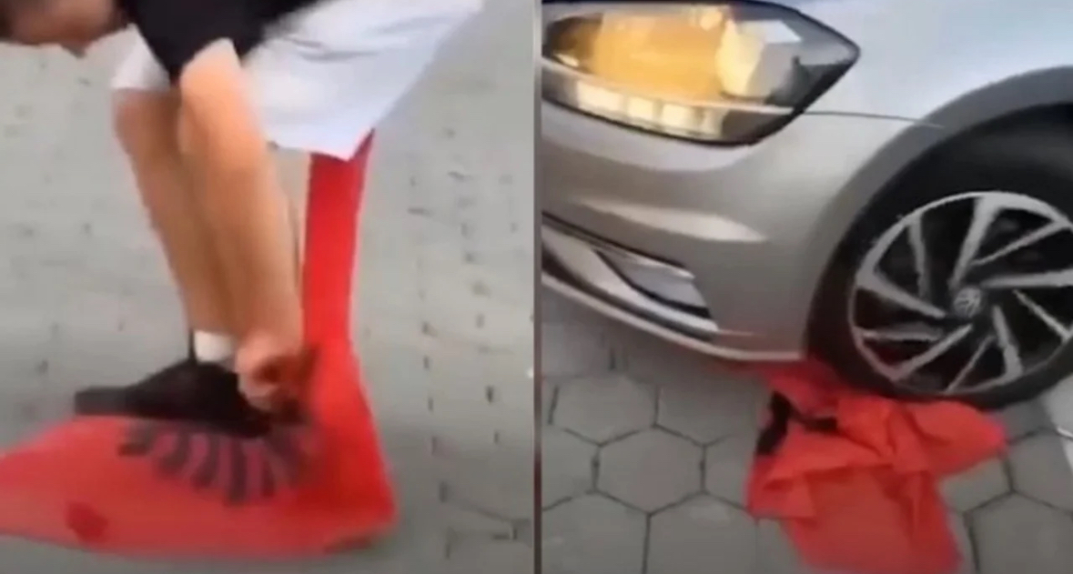 Në pamjet e shpërndara në rrjetet sociale, të rinjtë duken duke e hedhur flamurin në tokë dhe më pas duke e përdhosur atë duke kaluar sipër me automjet.