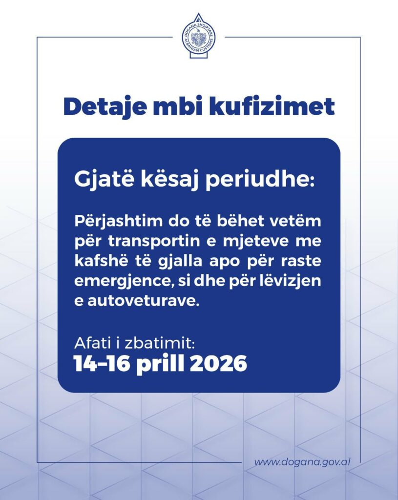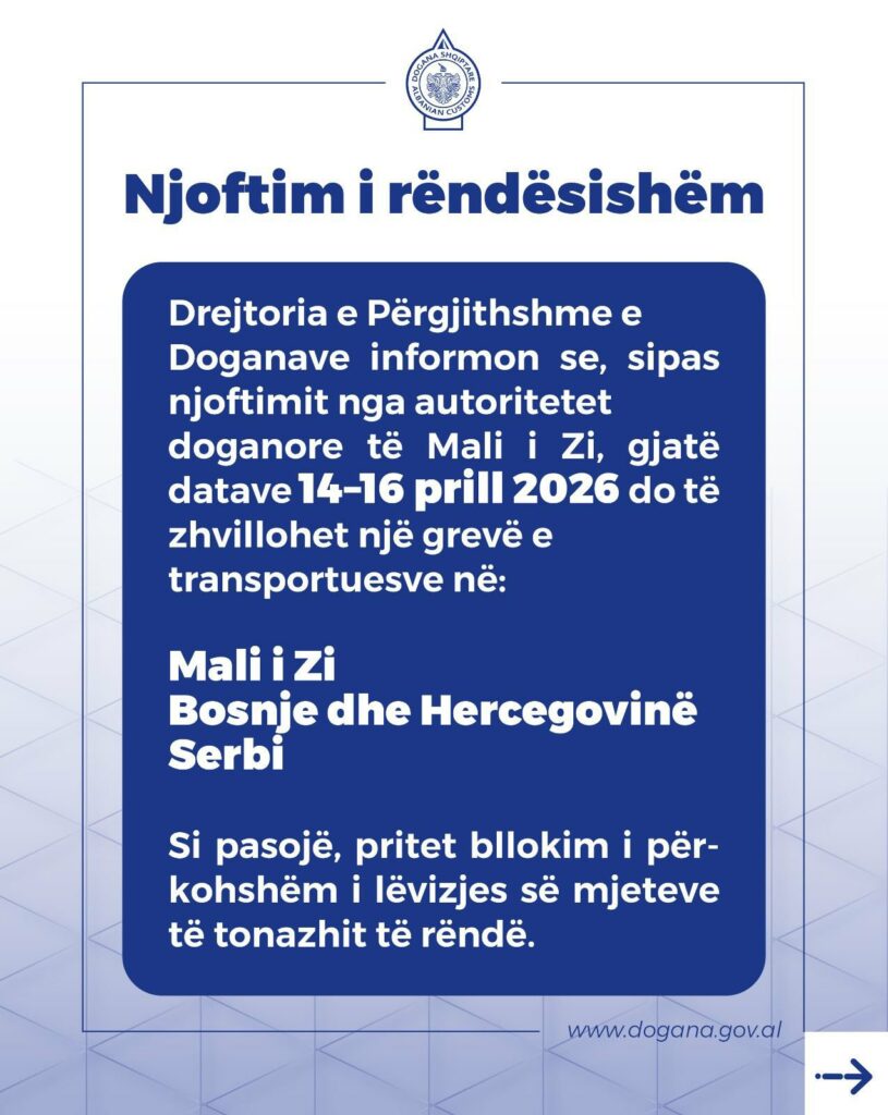 Drejtoria e Përgjithshme e Doganave ka njoftuar këtë të hënë, më 13 prill, se në tre ditët në vijim do të ketë një bllokim të përkohshëm në doganat drejt Malit të Zi, Serbisë dhe Bosnjes.