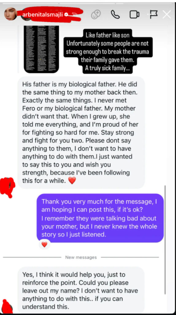 Një ndjekëse anonime i ka shkruar Arbenitës, duke zbuluar se në fakt ajo ishte vajza biologjike e babait të Feros, pra motra e tij, që nuk e ka takuar kurrë. Ajo pretendon se babai i reperit kishte bërë të njëjtën gjë me nënën e saj, duke e trajtuar keq dhe duke përsëritur ciklin e traumës që më pas Fero, sipas akuzave të Arbenitës, e kishte ushtruar edhe ndaj saj.