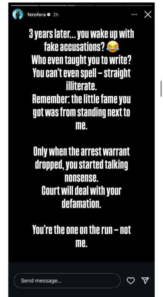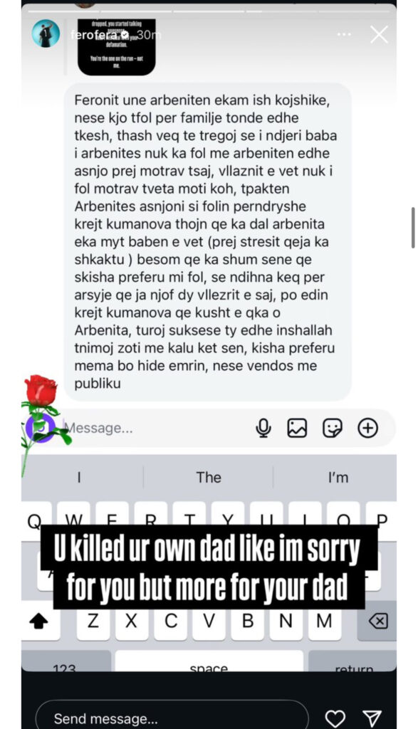 Por Fero nuk qëndroi duarkryq. Në reagimet e tij të radhës, reperi publikoi një tjetër “shpërthim” në rrjetet sociale, duke sulmuar ashpër nënën e vajzës së tij dhe duke shkuar deri aty sa ta akuzonte për vrasjen e babait.