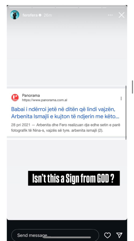 “Babai i tij është babai im biologjik. Ai i bëri të njëjtën gjë nënës sime atëherë. Fiks të njëjtat gjëra. Unë nuk e kam takuar kurrë Fero-n dhe as babain tim biologjik. Mamaja ime më tregoi gjithçka dhe jam krenare që ajo luftoi kaq shumë për mua. Ji e fortë dhe lufto edhe ti për veten dhe vajzën tënde. Të them vetëm këtë dhe të uroj forcë, sepse të kam ndjekur prej kohësh.”