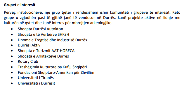 E ndërsa po punon prej dy vitesh më këtë projekt, që hapin e parë e hodhi më 9 qershor 2020, me marrëveshjen trepalëshe të nënshkruar mes përfaqësuesve të AADF, ministres së kulturës Elva Margariti dhe kryetares së bashkisë Durrës Emiriana Sako, Fondacioni thotë se gjatë kësaj periudhe ka zhvilluar konsulta me grupet e interesit të vendosura në Durrës, por nga kontaktet që “DurrësLajm” pati me disa prej tyre mohuan t’u ishte vënë në dispozicion një draft i planit të menaxhimit.