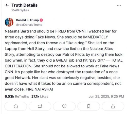 Presidenti i SHBA-së, Donald Trump, kërkoi sot shkarkimin e korrespondentes së CNN-së, Natasha Bertrand, pasi ajo transmetoi një vlerësim të brendshëm nga agjencitë e inteligjencës amerikane, sipas të cilit sulmet e SHBA-së ndaj tre objekteve bërthamore iraniane (Fordo, Natanz, Isfahan) në orët e para të së dielës së kaluar, shkaktuan vetëm një vonesë të përkohshme, prej disa muajsh, në programin e Teheranit.