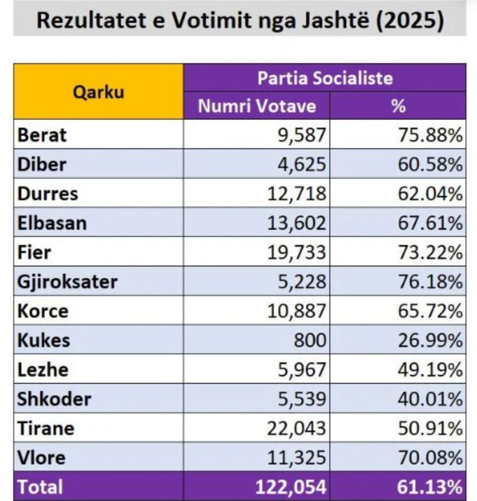 Në 12 qarqe të vendit, demokratët arritën të fitojnë vetëm një qark, Kukësin, ku morën gati 62% të votave, kurse PS-ja 27% të votave.