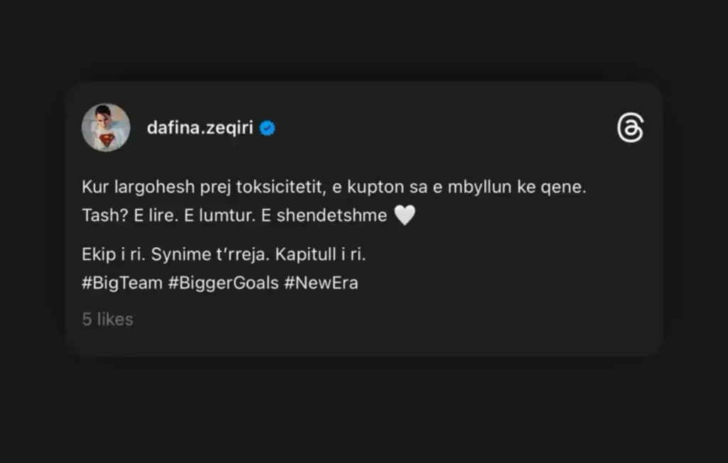 “Kur largohesh prej toksicitetit, e kupton sa e mbyllun ke qenë”, shkruan ajo, duke shtuar se tani ndjehet e lirë, e lumtur dhe e shëndetshme. Me një zemër të bardhë në fund, Dafina duket se ka vendosur të fokusohet në vetveten dhe në një rrugëtim të ri profesional dhe personal.