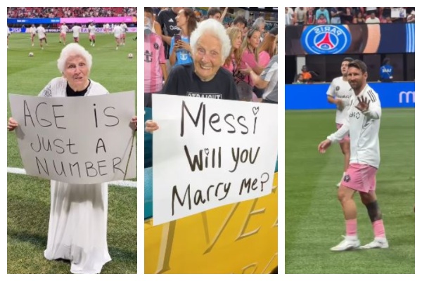 “Mosha është vetëm një numër”, ndërsa në dorë mbante edhe një trëndafil të kuq. Më pas kishte një pankartë tjetër: “Unë e dua Mesin”. Ndërsa “Pleshti” e përshëndeti me duar zonjën. Pak ditë më parë ajo kishte një tjetër pankartë ku i drejtohet legjendës së Barcelonës: “Mesi, do të martohesh me mua?”