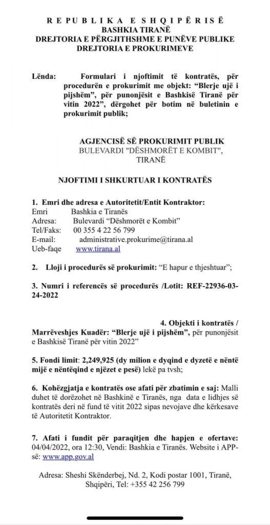 “Lodhet ER me propagandë, ja prish filmin EV! Kur qenka uji 24 orë në cdo familje tiranse pse Bashkia Tiranë ble 200,000 Euro ujë të pijshëm në vit për stafin e Bashkisë?”, shkruan Tabaku, ndërsa ka publikuar gjithashtu edhe dokumentin.