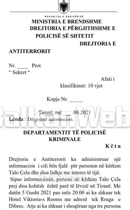 Drejtoria e Antiterrorit ka administruar një  informacion  i cili bën fjalë  për personin në kërkim Talo Çela dhe disa lidhje me interes të tijë.