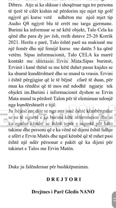 Në një material secret të Policisë së Shtetit, i cili është shpërndarë në rrjetet sociale pas hakerimit të emailit të ish Drejtorit të Përgjithshëm, Gledis nano thuhet se “Burimi ka informuar se në këtë objekt, Talo Cela ka qënë dhe para dy javësh, rreth datave 25-26 Korrik 2021. Herën e parë, Talo është parë na makinë me një femër dhe një femijë kurse  me datën 5 ka qënë vetëm”.