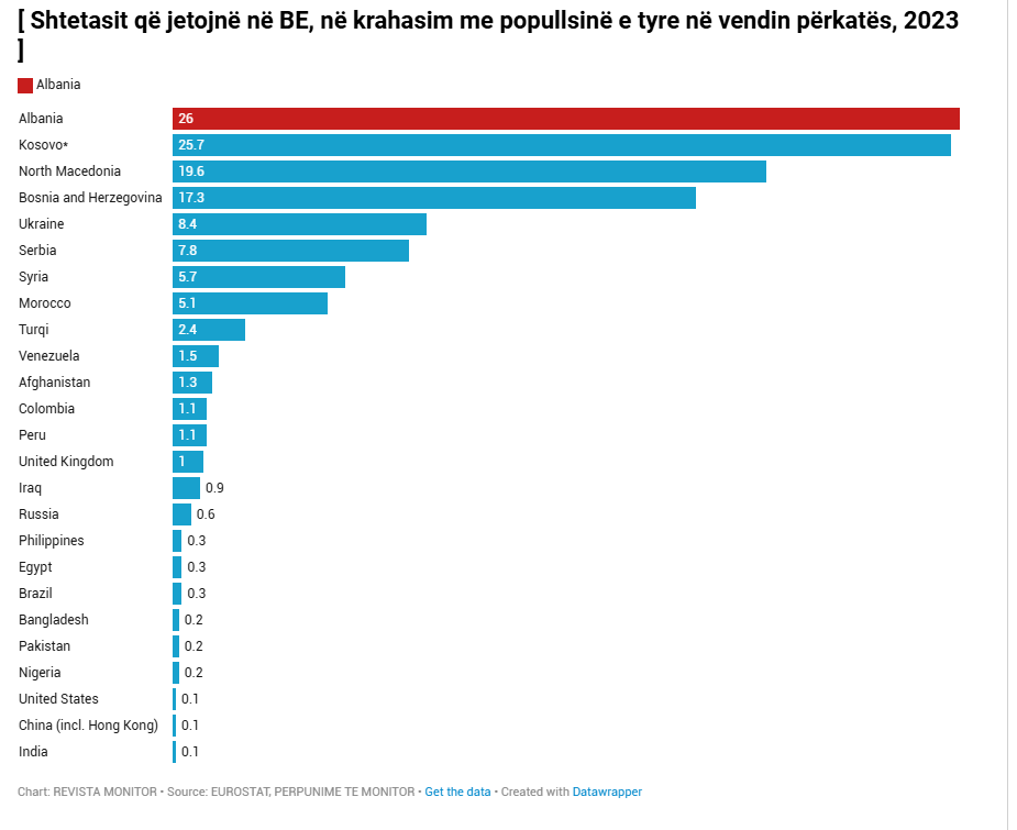 Në BE, sipas Eurostat jetojnë rreth 630 mijë shqiptare (të dhënat nuk përfshijnë Greqinë). Kjo është e barabartë me 26% të popullsisë që jeton në Shqipëri, duke na renditur të parët në BE, në raport me popullsinë, sipas të dhënave të përpunuara nga Monitor. Nëse shtohen dhe ata që jetojnë në Greqi, që janë të paktën 400 mijë persona, shifra e kalon 40%.