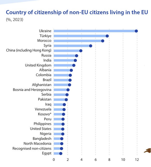 Komunitetet më të mëdha që jetonin në BE pa pasur shtetësi të një vendi anëtar ishin shtetasit ukrainas (11,9 %), turq (7,7 %), marokenë (7,1 %) dhe sirianë (5,3 %). Ndërkohë, shtetasit kinezë (përfshirë Hong-Kongun) dhe rusët zinin përkatësisht 3,9 % dhe 3,3 % të numrit të përgjithshëm.