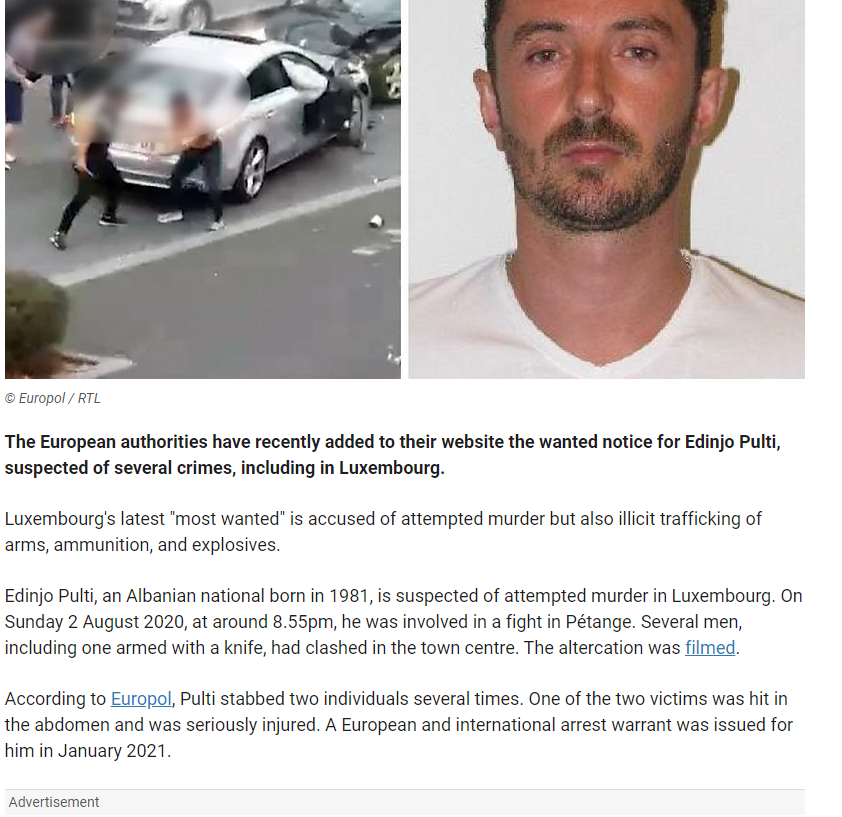 Mediumi “Today”, i Luksemburgut shkruan se Edinjo Pulti gjithashtu është shpallur si përsoni më i kërkuar në Luksemburg, pasi akuzohet për plagosje dhe tentative vrasjeje.