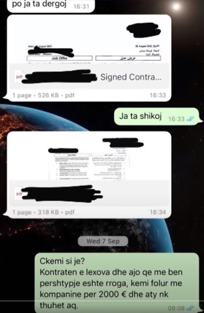 Vitet e fundit një fenomen që ka prekur edhe vajzat në vendin tonë, është dhe puna në vendet arabe. Gjatë emisionit “Me Zemër të Hapur”, janë publikuar pamje të kontratave dhe bisedave që kanë pasur vajzat shqiptare të cilat kanë aplikuar për punë si stjuardesa apo kamariere në agjencinë që i dërgonte në Arabi për të punuar si eskorta.