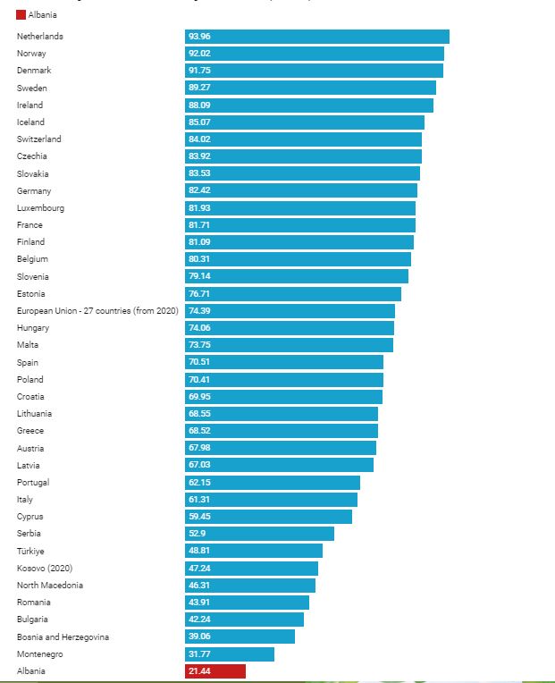 Nga rajoni më mirë renditet Serbia, me 52.9%, e ndjekur nga Kosova, që i ka të dhënat për vitin 2020, me 47.7%, Maqedonia e Veriut me 46.3%, Bosnjë Hercegovina, me 39%, ndërsa Mali i Zi është i parafundit përpara Shqipërisë, me 31.8%.