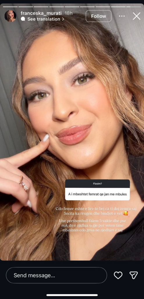 “Çdo femër është e lirë të bëjë ca t’i dojë zemra e saj. Secila ka rrugën dhe bindjet e veta. Unë përshembull falem 5 vakte dhe pse nuk do e zgjidhja si gjë për veten time mbështes çdo grua në zgjedhjet e saj”, shkruan ajo.