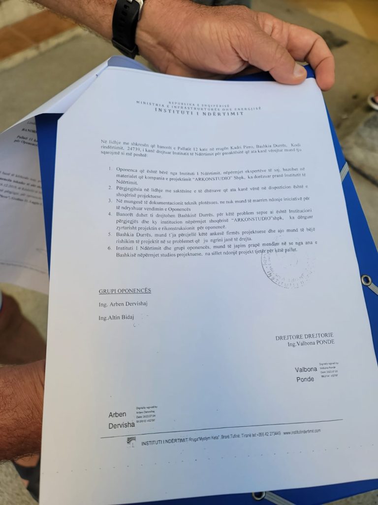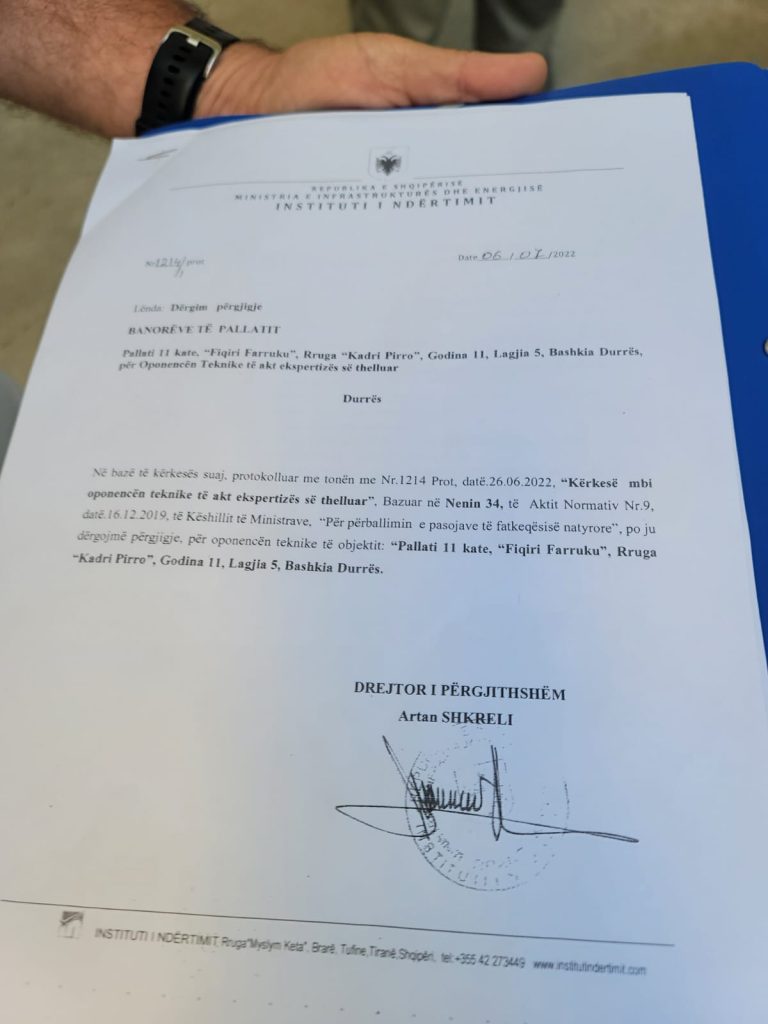 Instituti i Ndërtimit i rekomandon banorëve t’i drejtohen bashkisë, sepse nëse pretendimet e tyre janë të sakta, ky institucion mund ta rishikojë vendimin e marrë për shembjen e godinës.
